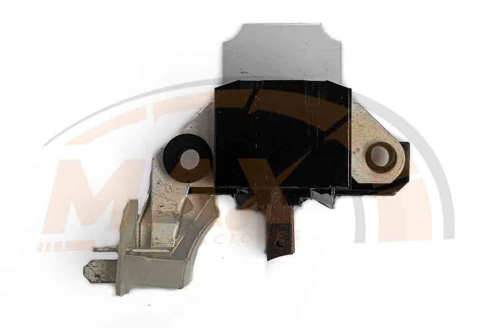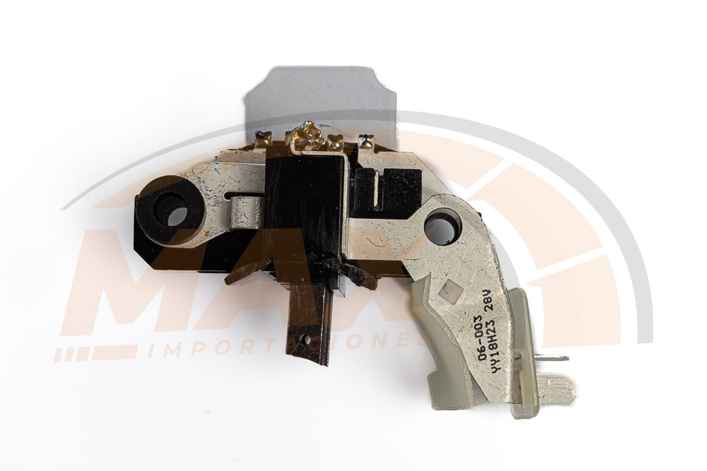 Regulador de voltaje o Relay de alternador con codigo 06-003 para vehículos livianos, como autos de modelo Mitsubishi Canter con sistema Mitsubishi. Está ubicado en la parte posterior del alternador de 24V con señales IG – L.